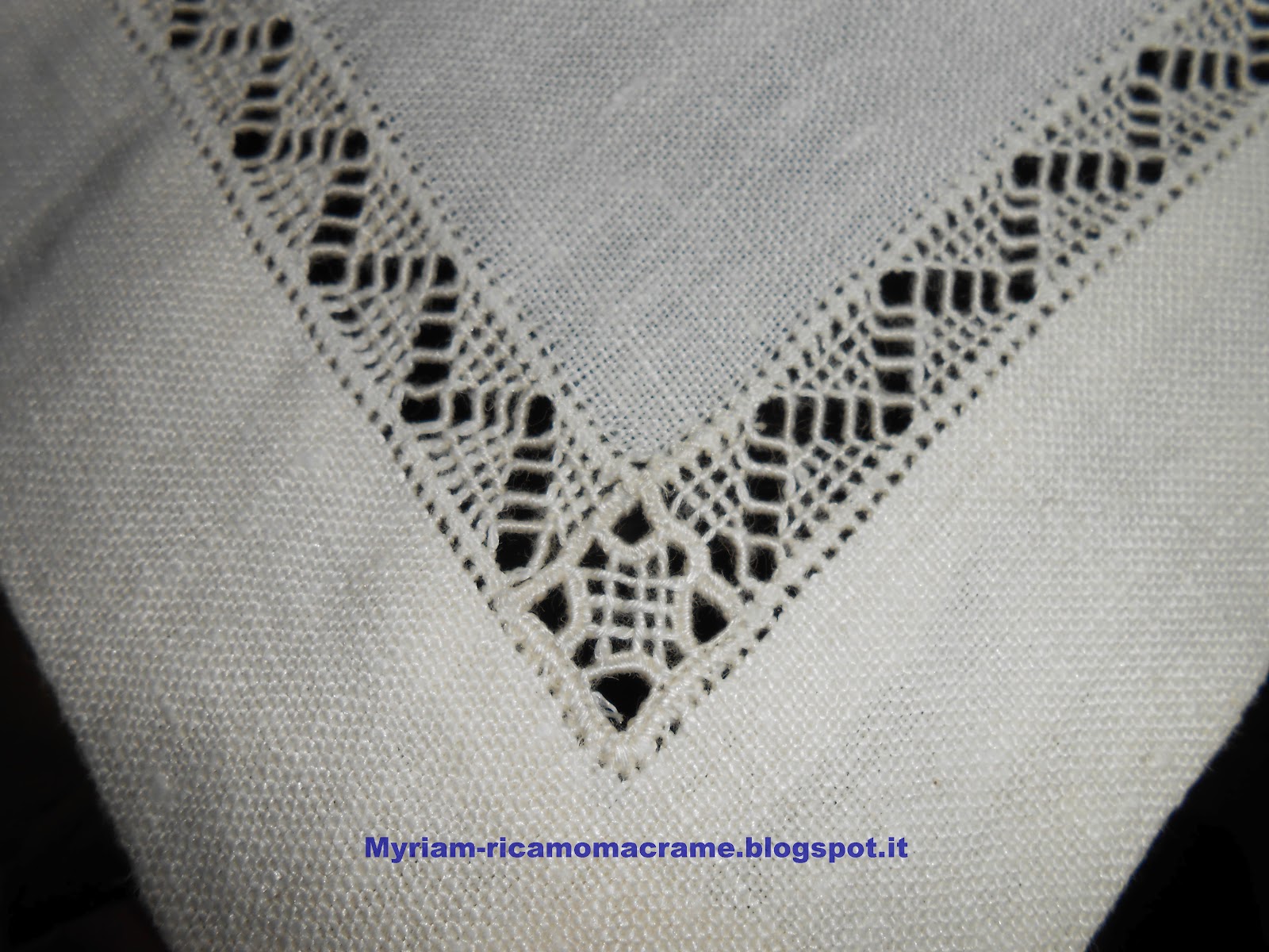 RispondiEliminaAnche a me piacciono tanto gli sfilati e tu sai farli proprio bene!! Bello lo sfilato della tovaglietta!! Non lo avevo mai visto.l'angolo è molto particolare. brava!!
