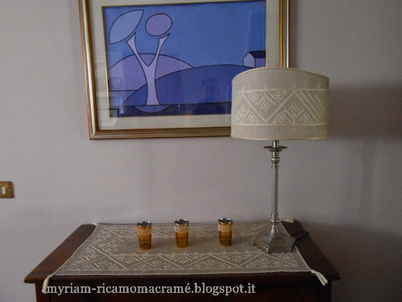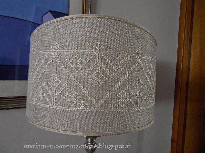 Prima ha fatto un centro e poi ha pensato di ricamare anche il paralume con la stessa tecnica e lo stesso disegno.